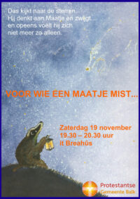 Op zaterdag, 19 november (19:00-20:30) is er in it Breahûs een uur gelegenheid om samen op verschillende manieren stil te staan bij het missen van een maatje:
