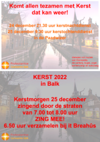 met veel zang en muziek. Concordia speelt, de Cantorij zingt, solo’s van zang en bugel, orgelmuziek en meer - 25 december 7.00u zingend door de straten van Balk,